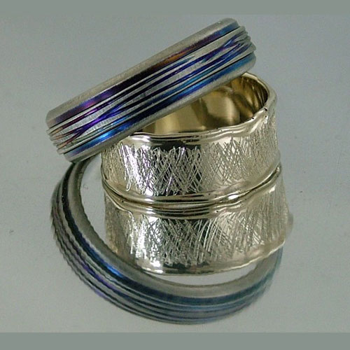 טבעת הראשונה הכולה זה טיטניום אפור שעשיתי לו הכחלה והטבעת מסתובבת , טבעת שניה עשויה מזהב לבן טבעי צבע מאוד מיוחד וסולידי .טבעות הנישואין שלנו נעשות בהתאמה ללקוח שלנו שמבקש יש הרבה אופציות ואנחנו פתוחים לרעיונות חדשים אז אם יש כזה דברו איתנו , אנחנו עובדים עם זהב על הגוונים שלו וסוגי הקארט הנפוצים בשוק עם כסף , טיטניום ועוד חומרים חדשים , אז שיהיה מזל טוב ונשמח לעזור .