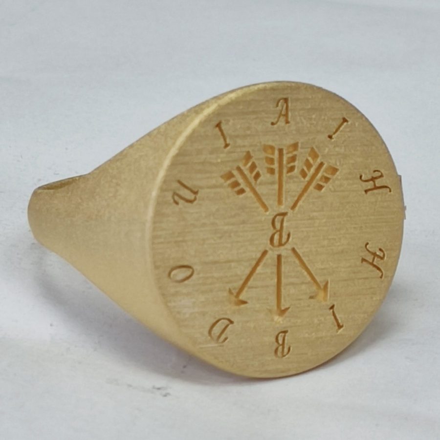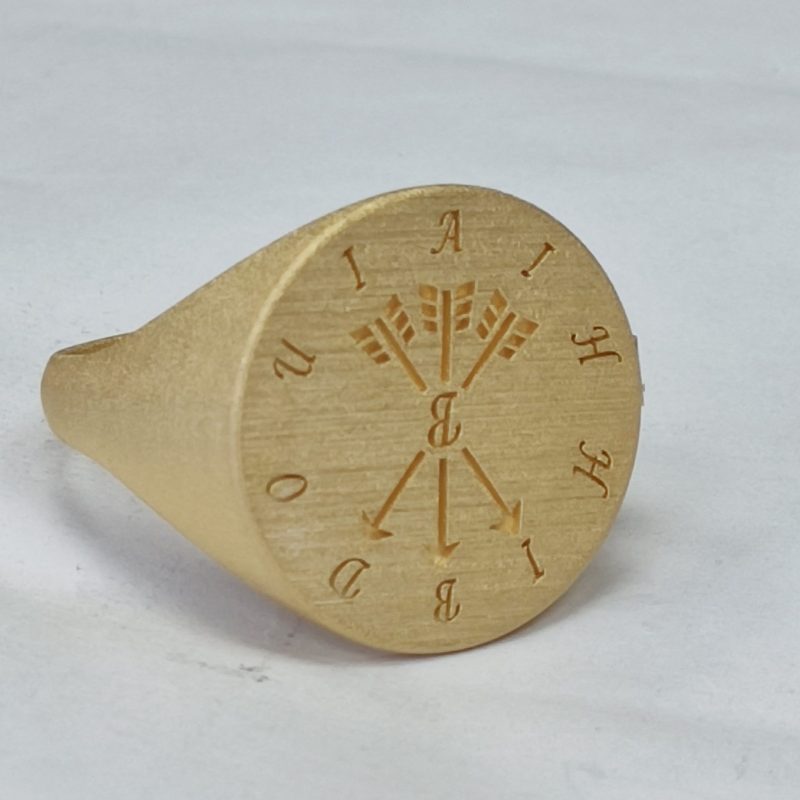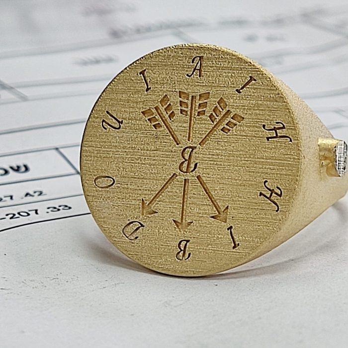 טבעת חותם לגבר בזהב צהוב עם חריטה אישית על החלק העליון של התכשיט , החריטה היא אותיות ראשונות של שמות בני במשפחה וגם עוד ברכות אישיות , דברו איתנו לכל חלום