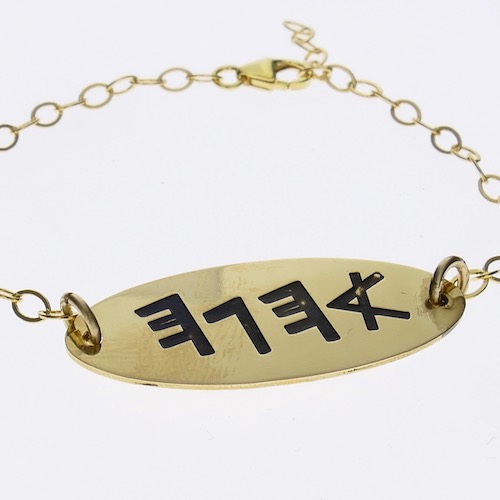 צמיד זהב עדין לענידה יומיומית, בגימור מבריק, חרוט עליו צירופי אותיות עבריות קדומות שלפי הקבלה מסמלות: