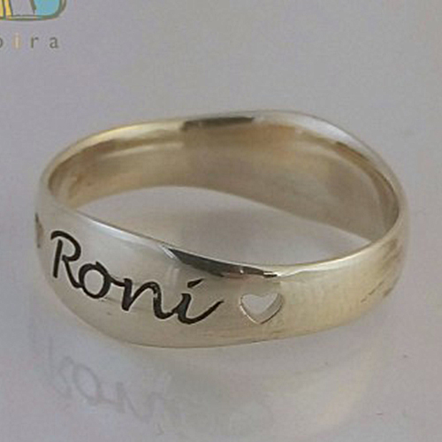 טבעת שם ברוחב שונה עם חריטה של שם של האהוב שלכם בעברית או אנגלית בתוספת של לב חלול בצידי השם למראה של אהבה ומצידו השני שיבוץ של יהלום אמיתי.